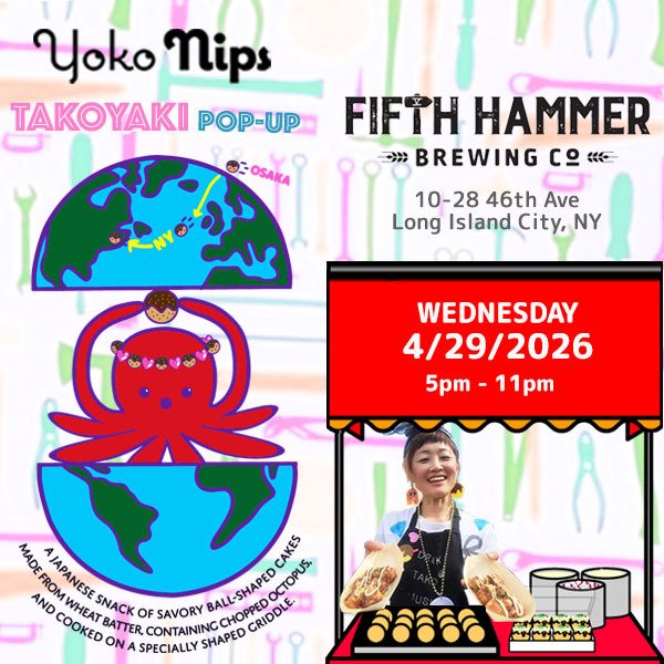Yoko Nips Wednesday, April 29, 2026 5:00 PM 11:00 PM 17:00 23:00 Fifth Hammer Brewing 10-28 46th Ave Long Island City United States (map) Google Calendar ICS YOKO NIPS TAKOYAKI POP-UPA SAVORY JAPANESE SNACKSMALL BALL-SHAPED CAKES MADE FROM OCTOPUS (VEGETARIAN AVAILABLE TOO!)Check out their Instagram