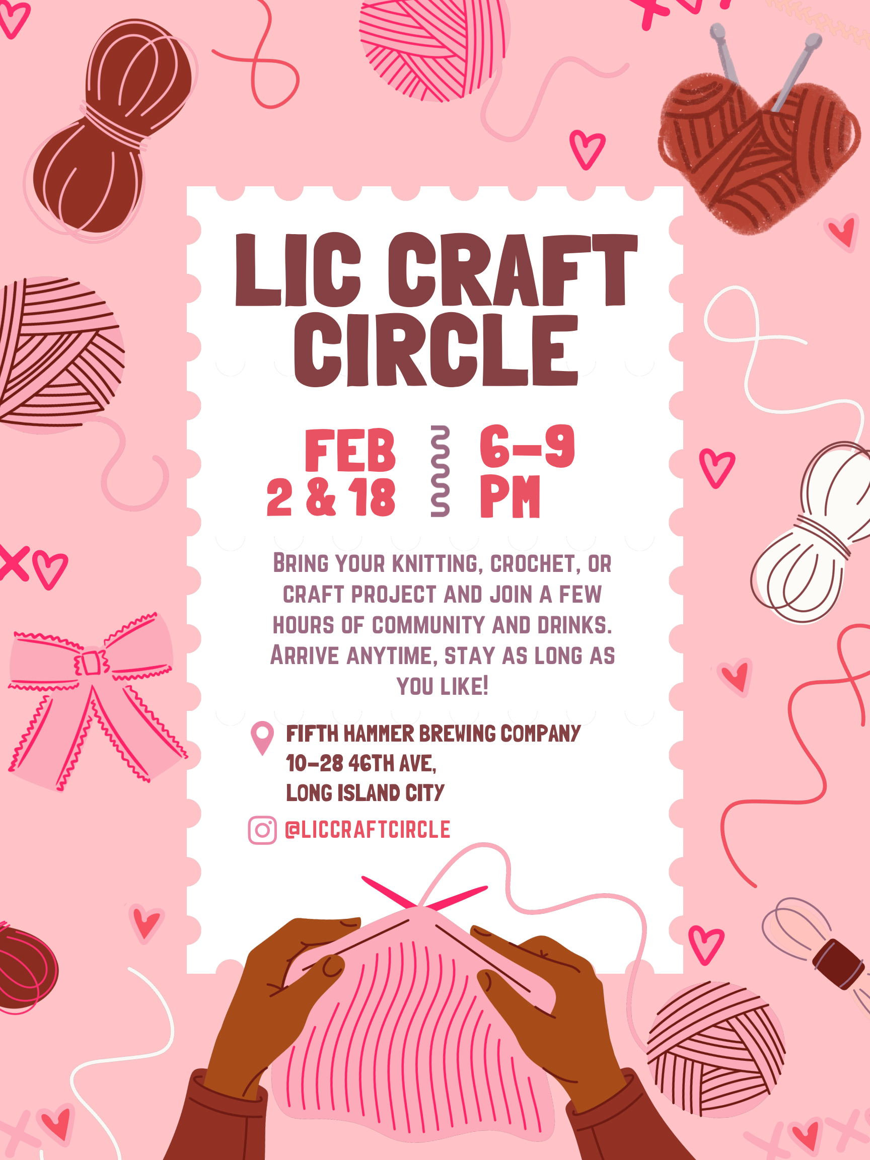 LIC Craft Circle Wednesday, February 18, 2026 6:00 PM 9:00 PM 18:00 21:00 Fifth Hammer Brewing 10-28 46th Avenue Queens, NY, 11101 United States (map) Google Calendar ICS BYO Knitting, crochet & craft community meetups in LIC. More info here!