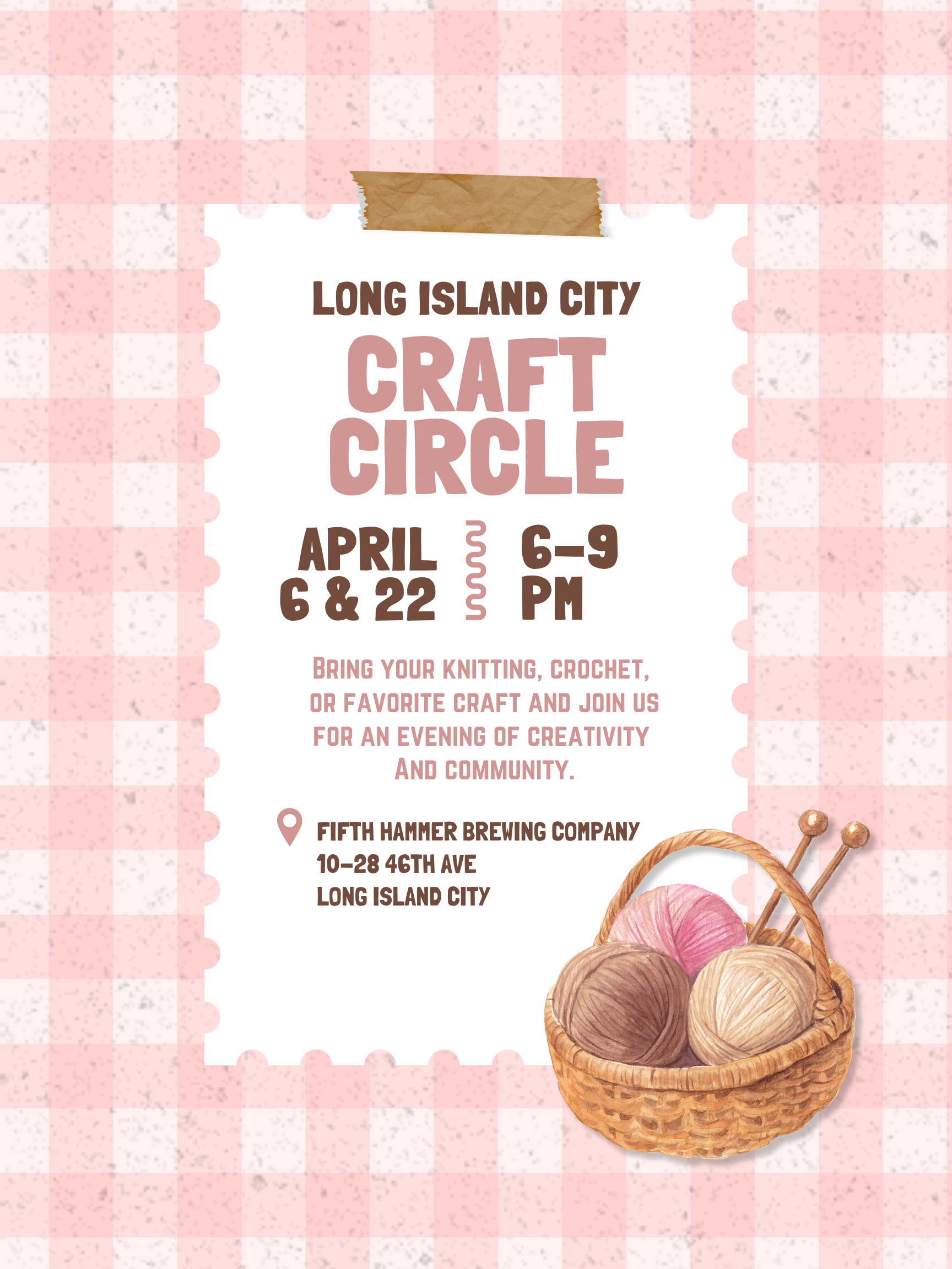 LIC Craft Circle Monday, April 6, 2026 6:00 PM 9:00 PM 18:00 21:00 Fifth Hammer Brewing 10-28 46th Avenue Queens, NY, 11101 United States (map) Google Calendar ICS BYO Knitting, crochet & craft community meetups in LIC. More info here!